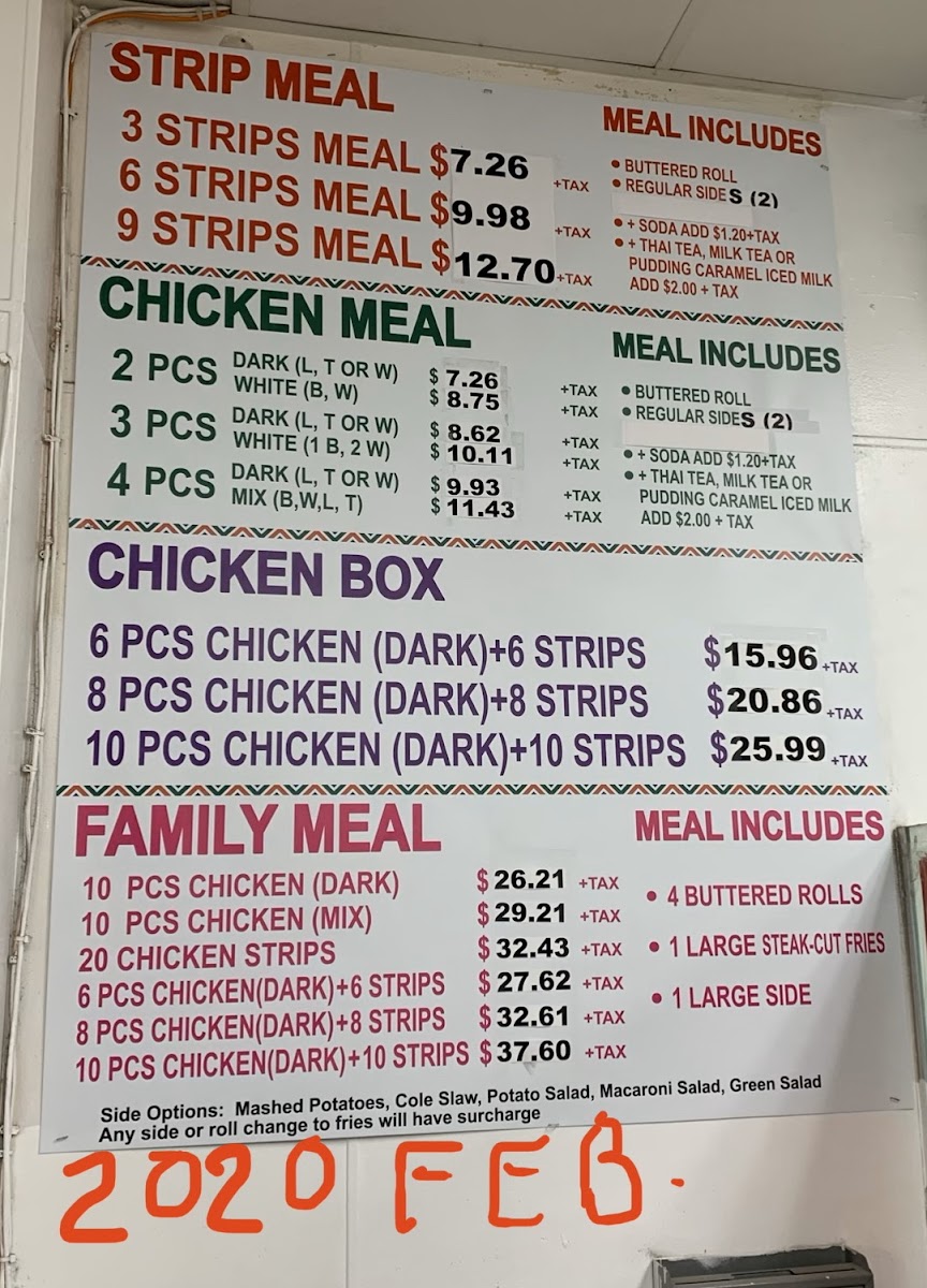 Includes 6 pc chicken & 6 chicken strips, 3 sauces, 4 dinner rolls, 1 large steak cut fries, and 1 large side.