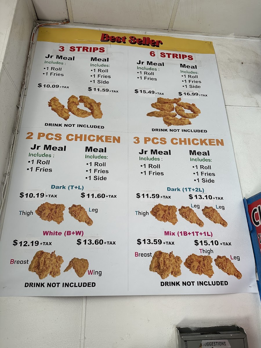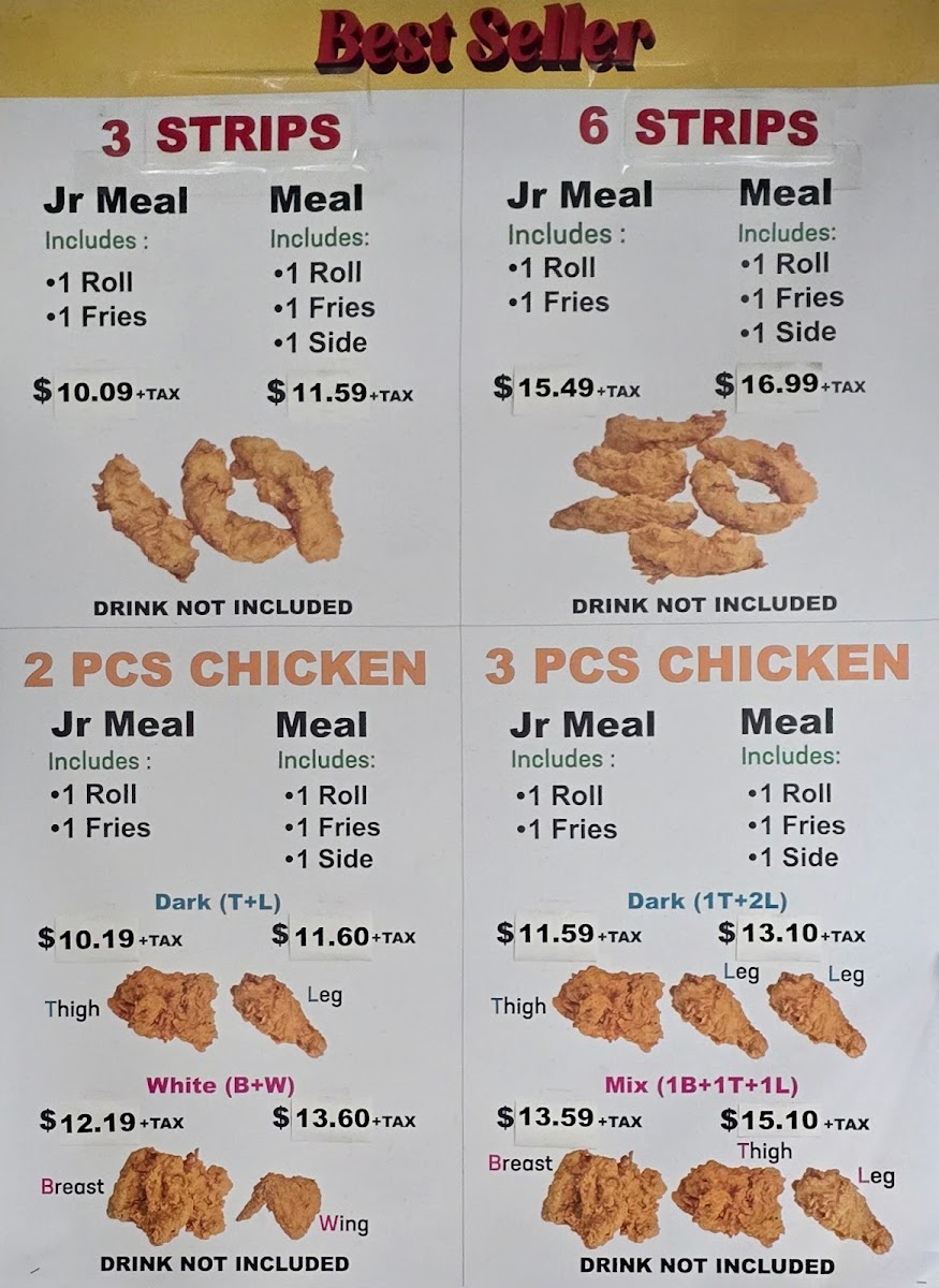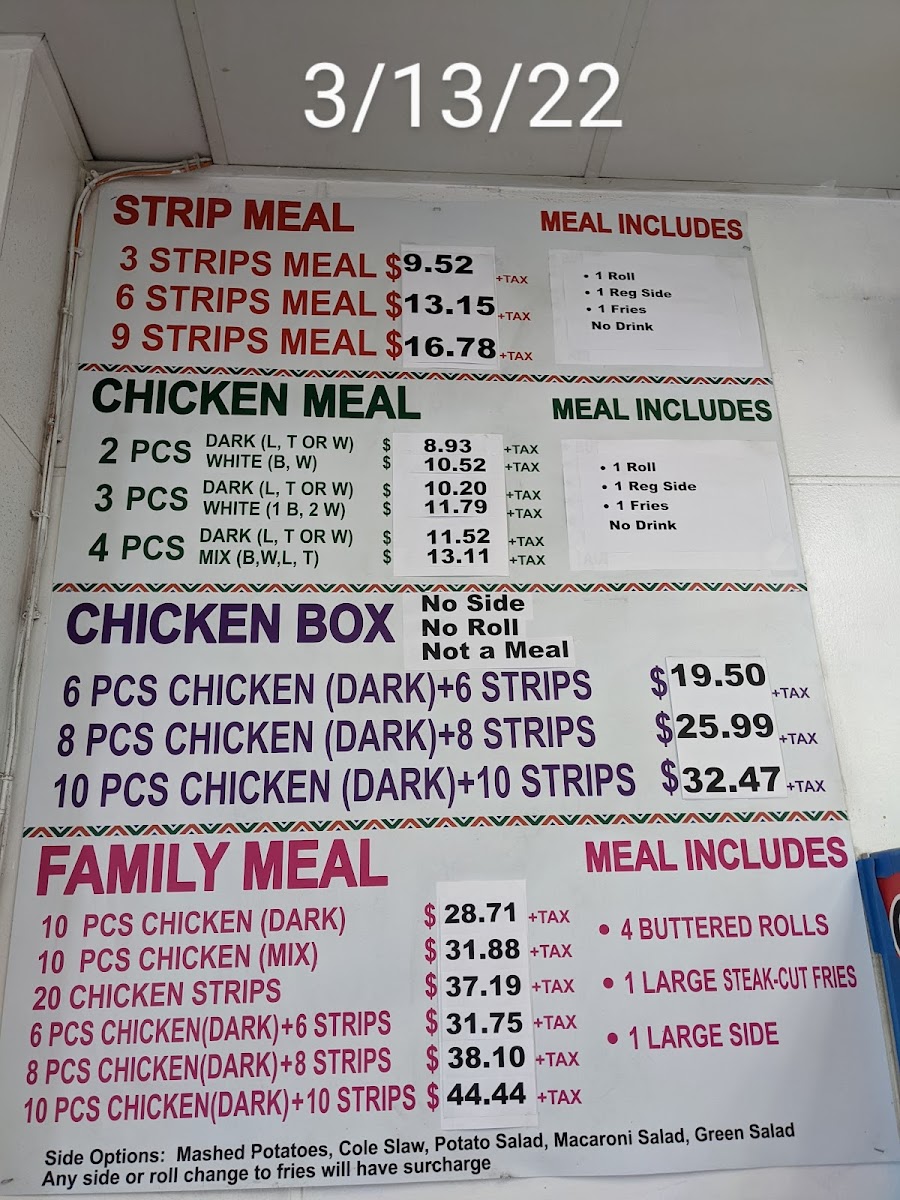 Comes with dinner roll, steak cut fries, one regular side, and four pieces.