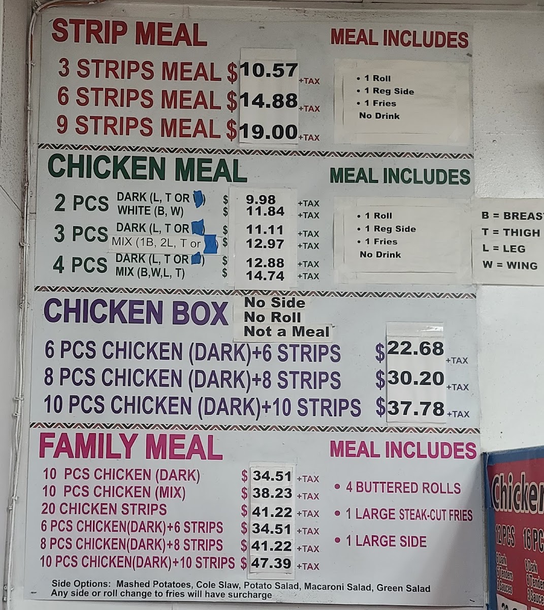 Includes 10 pc chicken (dark or mixed), 4 dinner rolls, 1 large steak cut fries, and 1 large side.